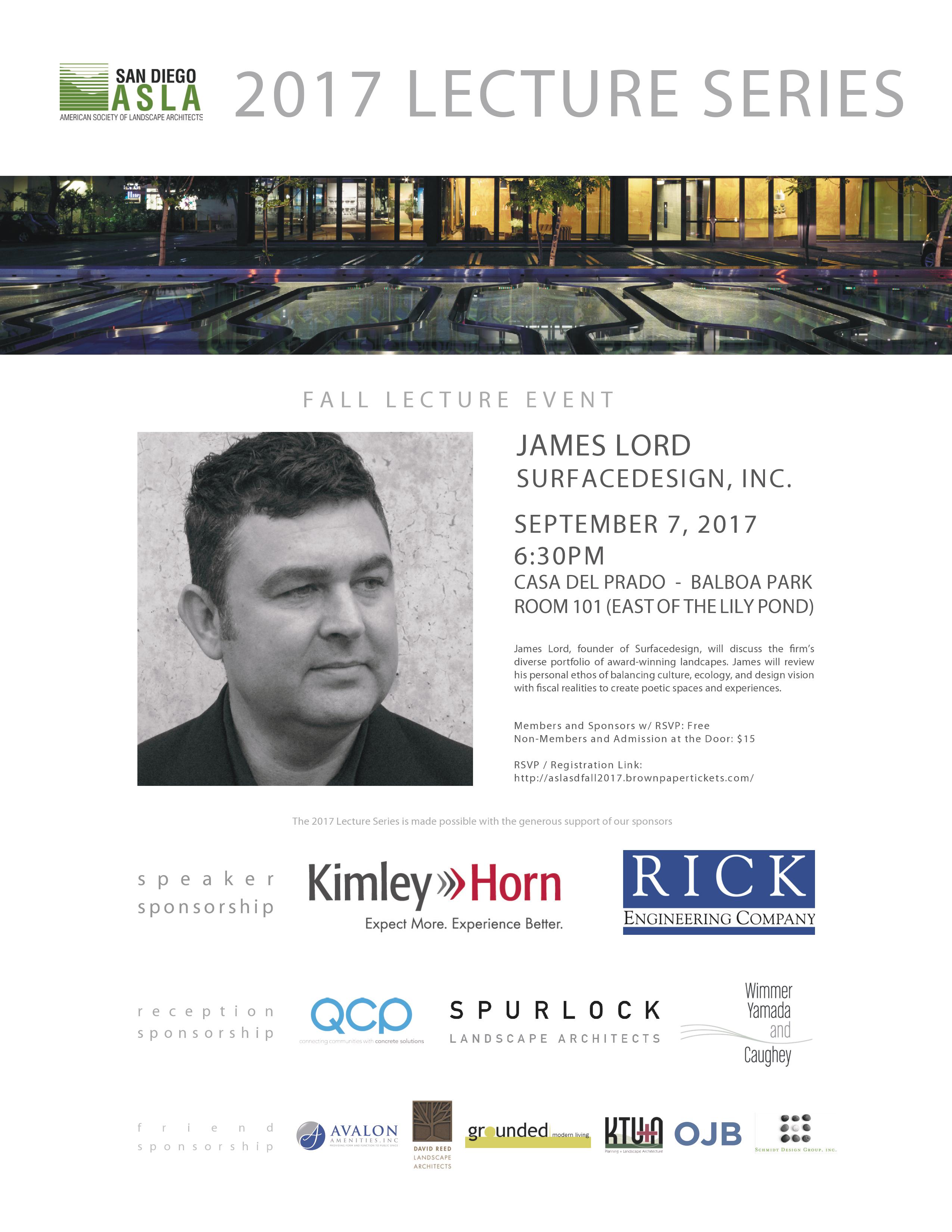 James Lord, founder of Surfacedesign Inc., will discuss the firms diverse portfolio of award-winning landscapes. James will review his personal ethos of balancing culture, ecology, and design vision with fiscal realities to create poetic spaces and experiences.