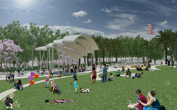 The $15 million first phase of the park will contain 10 acres of play fields, two basketball half-courts, a community garden, rose gardens, an outdoor grassy amphitheater and a 100-foot flagpole as a tribute to the military.