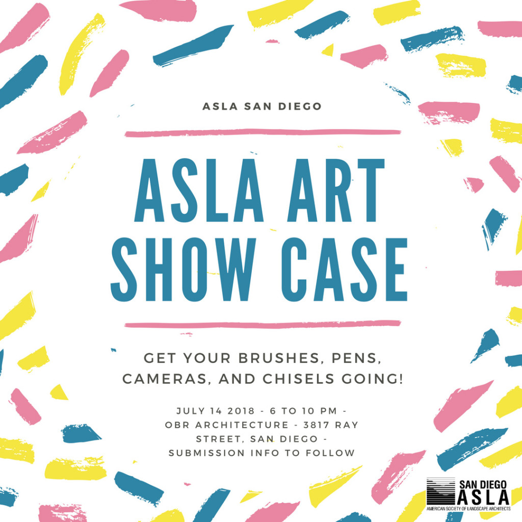 The ASLA Art Showcase will be graciously hosted again by OBR Architecture on July 14th during the Ray at Night Festival. The Ray at Night Festival, being a public event, will give ASLA San Diego the opportunity to increase its public visibility and awareness.