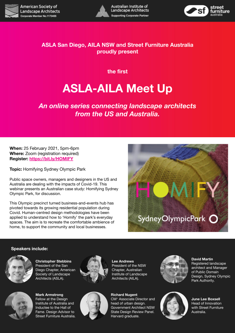 ASLA San Diego President, Chris Stebbins and Australian Institute of Landscape Architects President, Lee Andrews invite you to this first of a series of joint events to introduce professionals from both countries to hear about the latest in design concepts. They will introduce you to June Boxsell who will moderate the conversation of the following presenters.