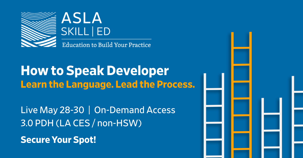 ASLA is excited to announce the upcoming virtual event ASLA SKILL | ED: How to Speak Developer, May 28-30 Join ASLA for this three-part course series designed to empower landscape architecture professionals at any point [...]