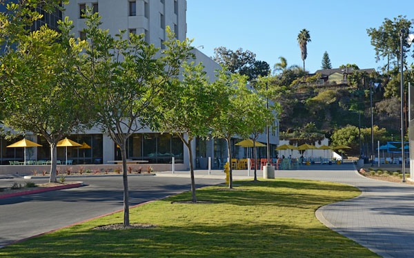 KTUA, a San Diego-based planning and landscape architecture firm, has transformed the parking lot of the formerly shuttered Cabrillo Hospital into a gathering and green space for the many students who study at the new home of the EF International Language Center.