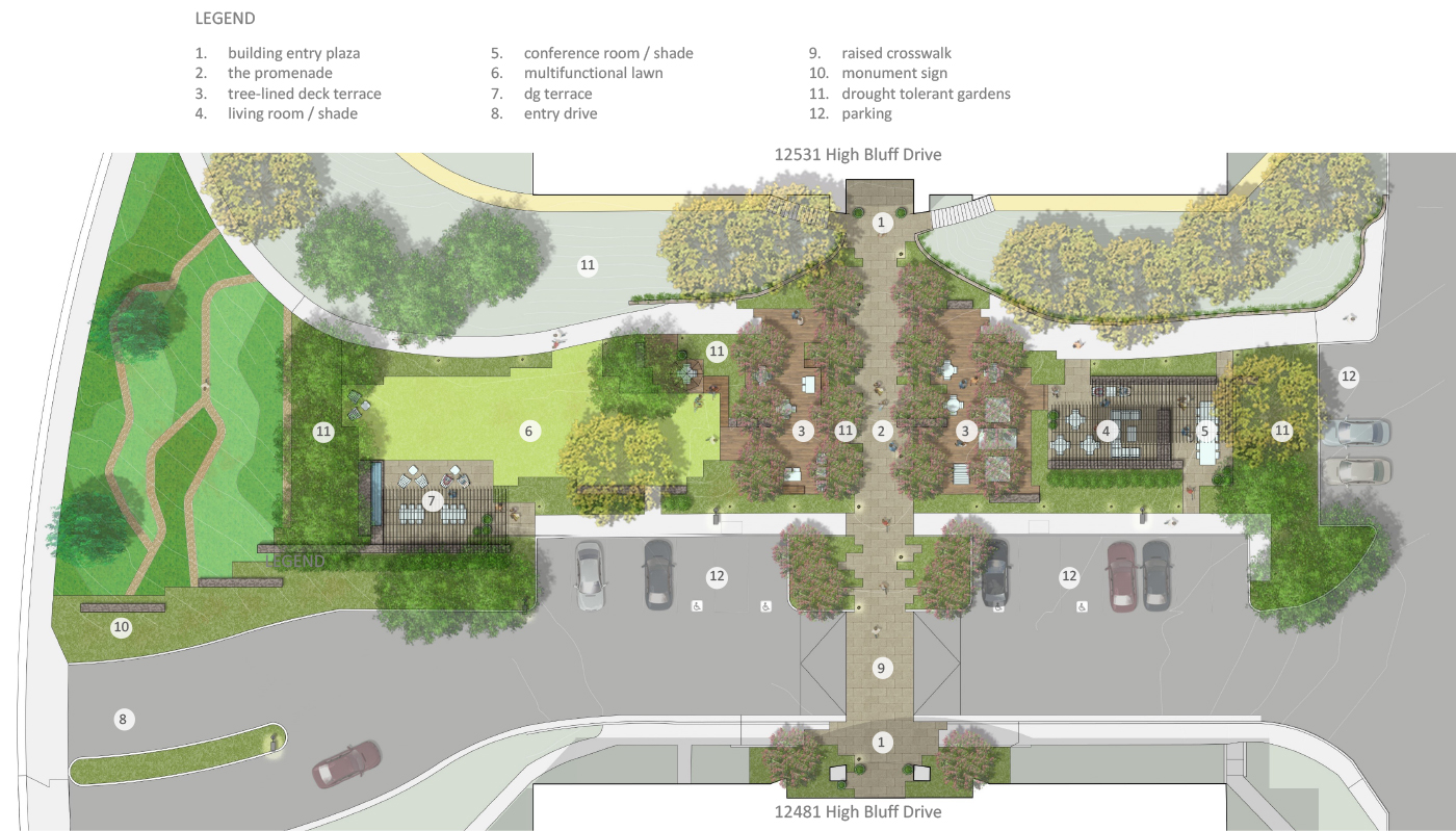 The use of outdoor rooms on this project seems to be successful, creating a variety of attractive, intimate spaces for gathering.